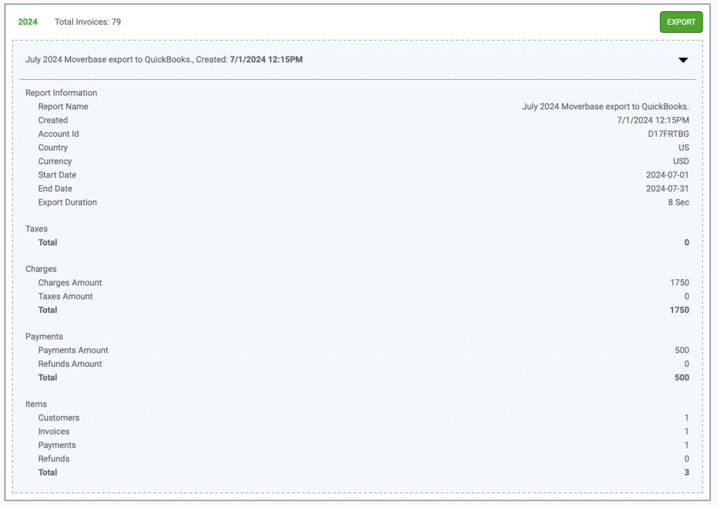 - Go to Setup > Integrations > QuickBooks in your Moverbase account and click the button to connect your QuickBooks account. Follow authentication instructions to connect the accounts. You will see a summary of the successful connection like this one below: